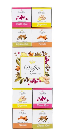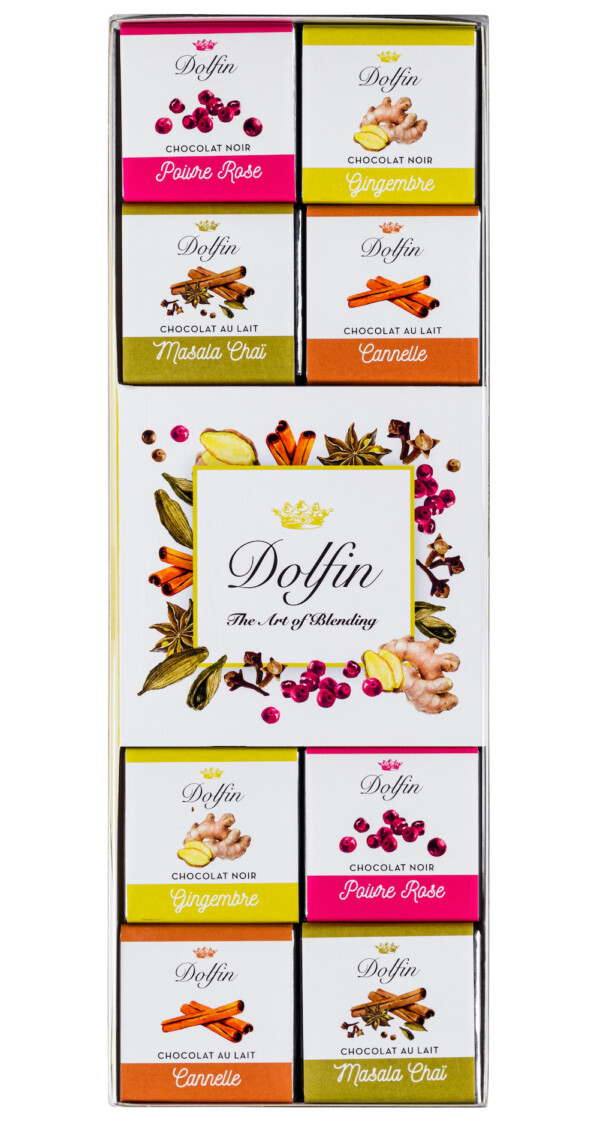 Sortiment von 24 Schokoladen-Quadraten mit 4 verschiedenen Geschmacksrichtungen: Zartbitter Ingwer, Zartbitter rosa Pfeffer, Vollmilch Masala-Chaï und Vollmilch Zimt.