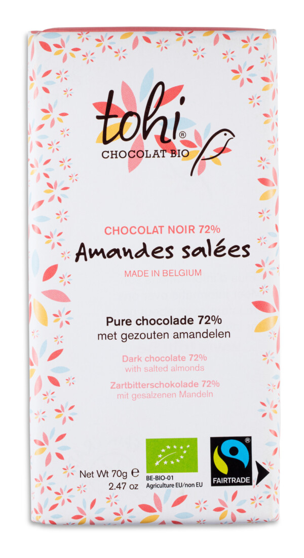 Zutaten : Kakaopaste *, Rohrzucker *, Kakaobutter *, gesalzene geröstete Mandeln * 4% (Mandeln, Soja, Weizen, Salz), Vanille *. Kakao : 72% mindestens. Kann andere Nüsse, Milch, Eiern und Sesam enthalten. * Produkte aus ökologischem Landbau. CERTISYS-BE-BIO-01 Control - www.certisys.eu - Fairtrade-Kakao, Zucker und Vanille. Gesamtanteil 96%. Visit info.fairtrade.net/sourcing.