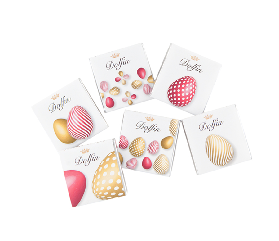 Sortiment an losen Schokoladen-Minitafeln “Ostern” inklusive 6 Geschmacksrichtungen : Vollmilch 37% Kako, Vollmilch Kaffee, Vollmilch nougatine, Zartbitter 70% Kakao, Zartbitter nougatine und Zartbitter Orange.