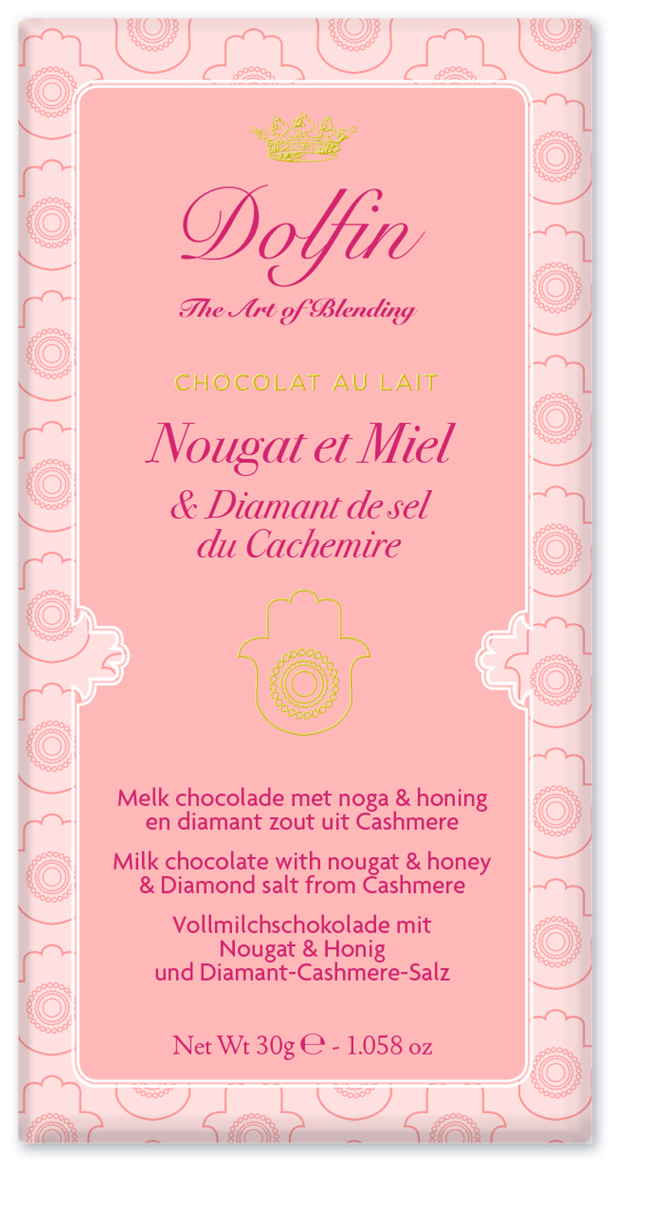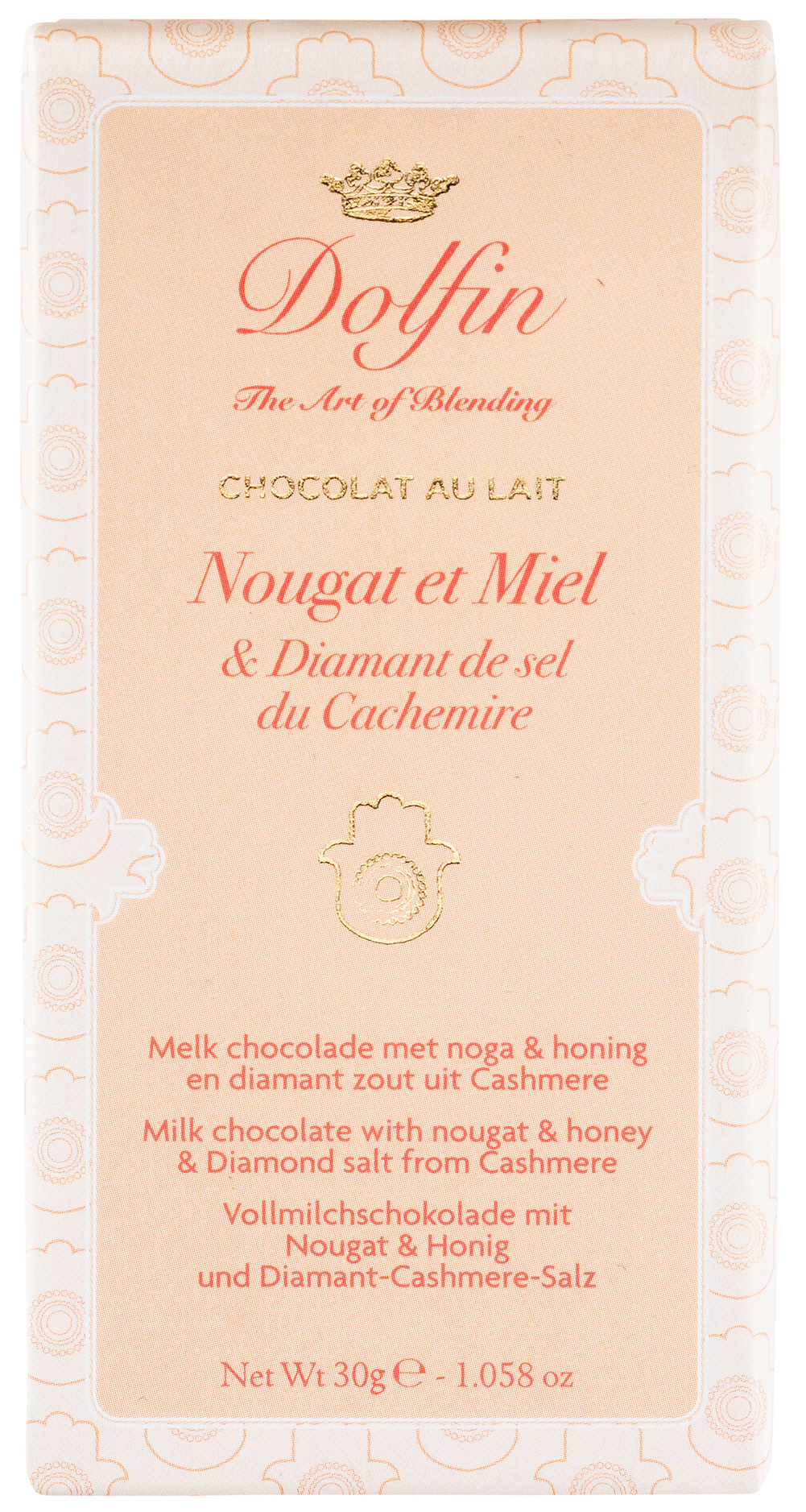 Zutaten: Zucker, Kakaomasse, Kakaobutter, Vollmilchpulver, Nougat 4% (Zucker, Glukosesirup, Mandeln, Kartoffelstärke, Honig, Kakaobutter, Eiweiß, natürliches Vanillearoma.), Emulgator: Sojalecithin, Salz Diamant 0,2%, natürliches Honigaroma, natürliches Vanillearoma. Kakao: 37% mindestens. Kann Spuren von anderen Schalenfrüchten, Gluten und Sesam enthalten.
