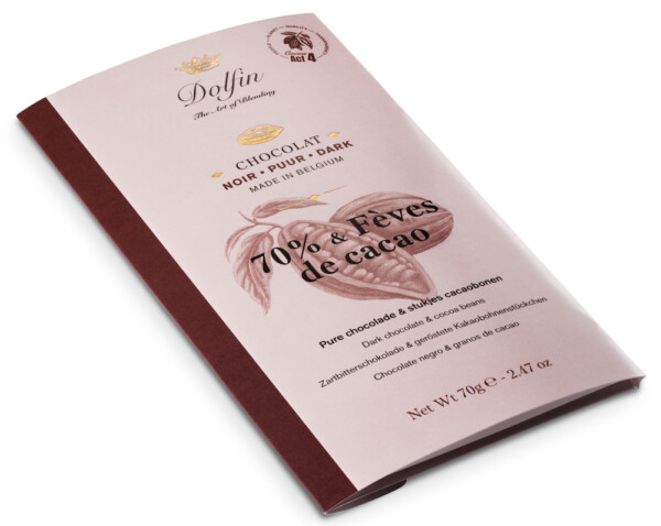 Die knusprigen, aromatischen Kakaobohnenstücke heben den starken Charakter dieser 70%-igen Bitterschokolade hervor und vereinen zwei Geschmacksfacetten von Kakao in einer Tafel.