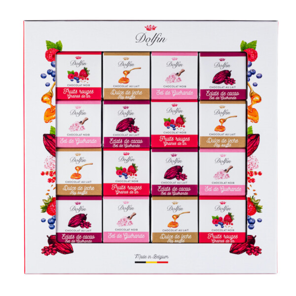 The assortment includes 4 different flavours: milk dulce de leche milk & puffed rice, milk cocoa nibs & Guerande salt, dark 70% cocoa & Guerande salt and dark red fruits & linseed.