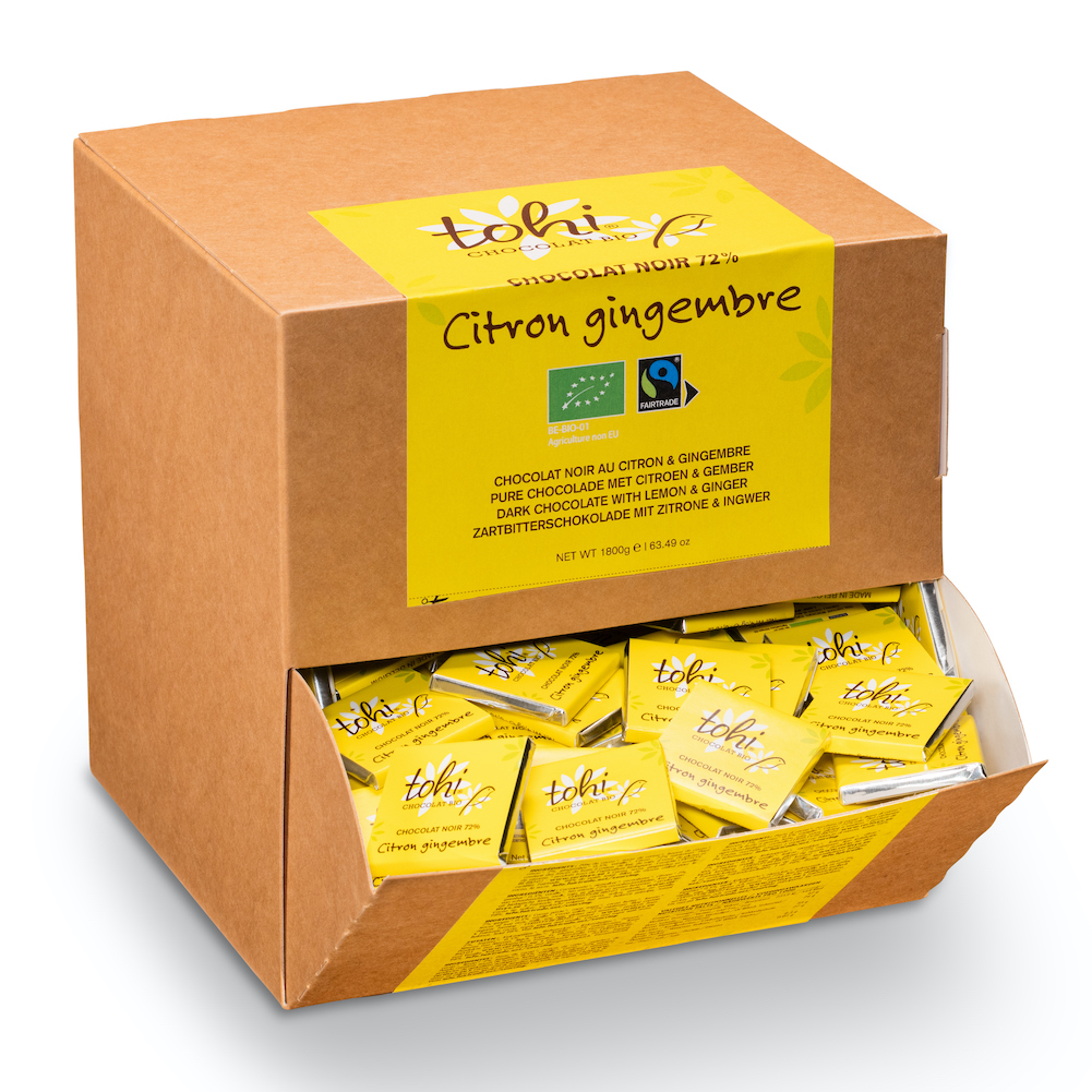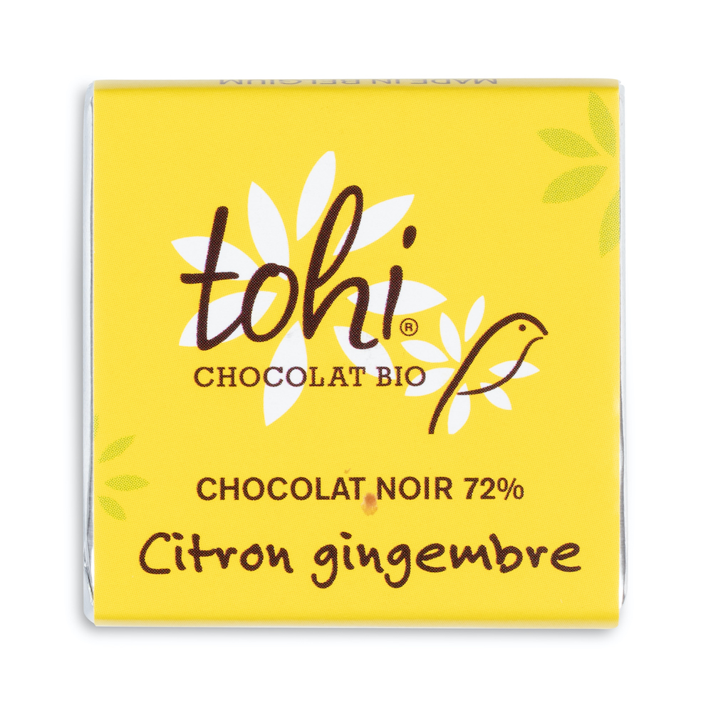 Ingredients : Cocoa paste *, cane sugar *, cocoa butter *, lemon * 2%, ginger * 0.5%, vanilla *. Cocoa solids : 72% minimum. May contain tree nuts, milk, soy, eggs, wheat and sesame. * products from organic farming - CERTISYS-BE-BIO-01 control - www.certisys.eu - Fairtrade cocoa, sugar, ginger and vanilla. Total 98%. Visit info.fairtrade.net/sourcing.