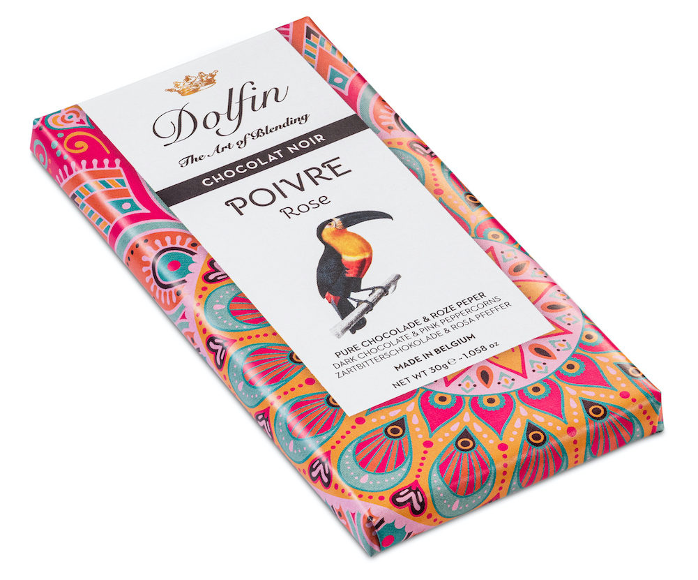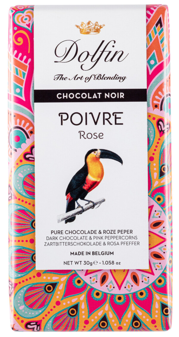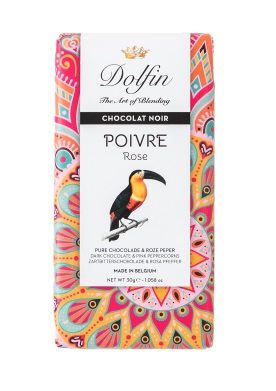 Ingredients: Cocoa mass, sugar, cocoa butter, pink peppercorns 1%, emulsifier: soy lecithin, natural vanilla flavouring. Cocoa solids: 60% minimum. May contain traces of milk, tree nuts, wheat, sesame and eggs.