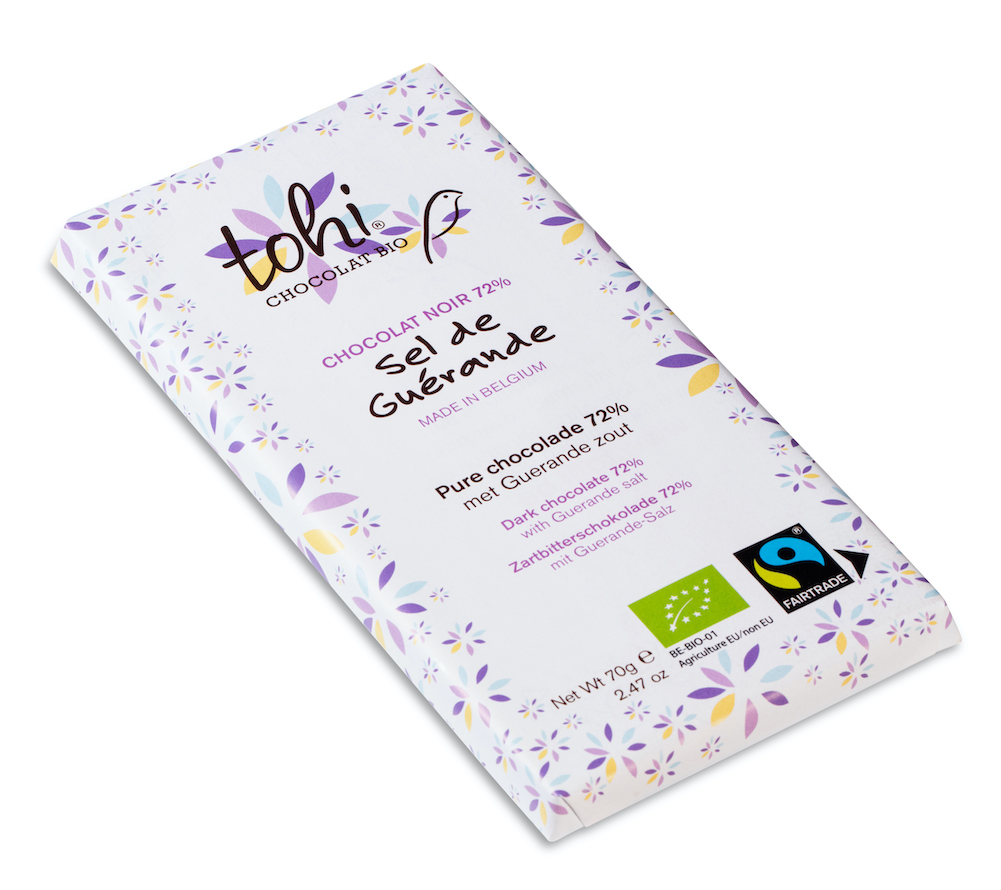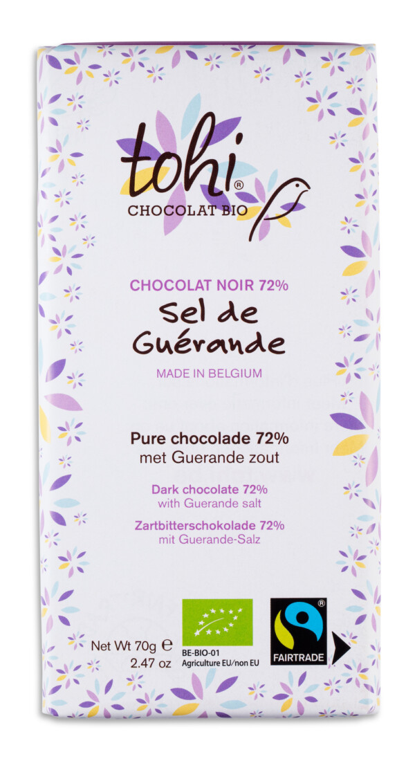 Ingredients : Cocoa paste *, cane sugar *, cocoa butter *, Guerande salt 0.2%, vanilla *. Cocoa solids : 72% minimum. May contain tree nuts, milk, soy, eggs, wheat and sesame. * products from organic farming - CERTISYS-BE-BIO-01 control - www.certisys.eu - Fairtrade cocoa, sugar and vanilla. Total 99.8%. Visit info.fairtrade.net/sourcing.