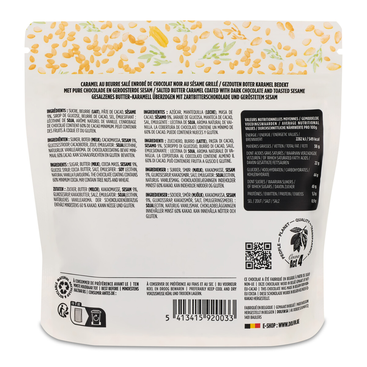 Ingredients : Sugar, butter (milk), cocoa mass, caramelized sesame 9%, glucose syrup, cocoa butter, salt, emulsifier: soy lecithin, natural vanilla flavouring. The chocolate coating contains 60% minimum cocoa. May contain tree nuts and wheat.