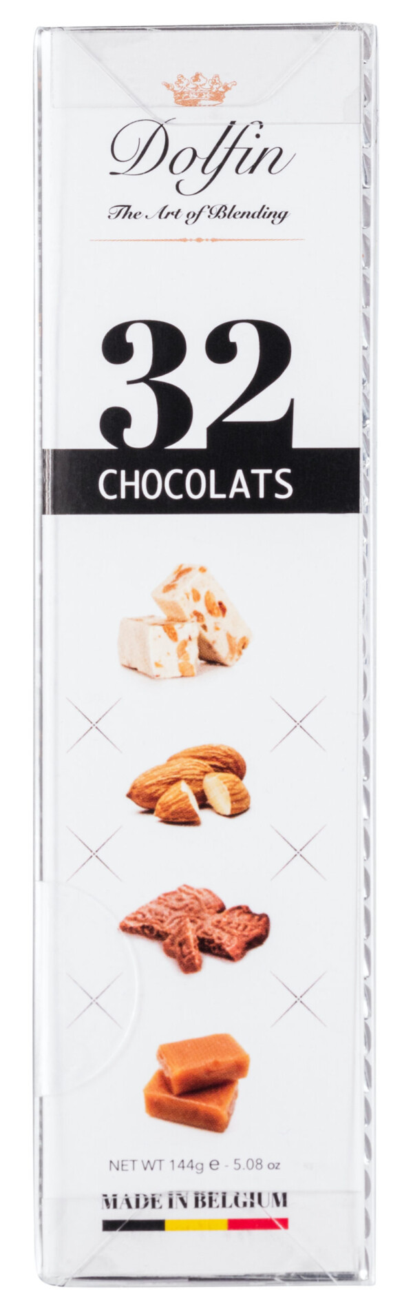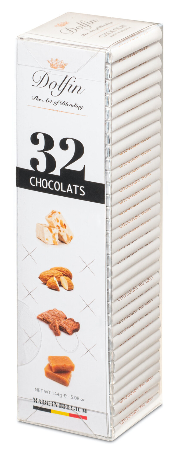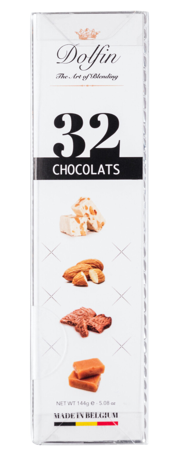 Assortiment van 32 chocolaatjes, met 4 smaken: melk speculaas, melk karamel, puur gezouten amandelen en puur noga.