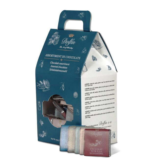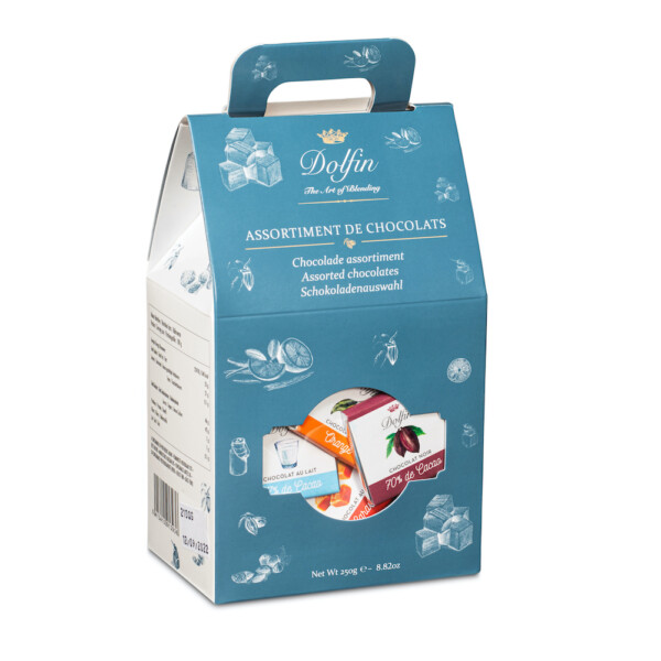 Een elegante en stijlvolle doos met een mooi assortiment van 6 traditionele chocoladesmaken: melk 37% cacao, melk karamel, melk dulce de leche & gepofte rijst, puur 70% cacao, puur sinaasappel en puur nougatine.