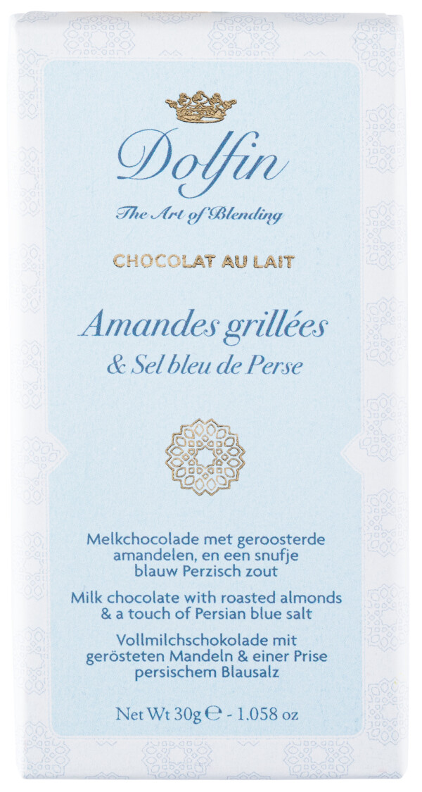 Een combinatie van contrasterende smaken die ons verlangen naar rijkdom & verborgen schatten doet opflakkeren … Fijne, intens blauwe zoutkorrels die de indruk geven alsof de zachte melkchocolade met geroosterde amandelen vol zit met kleine saffieren …