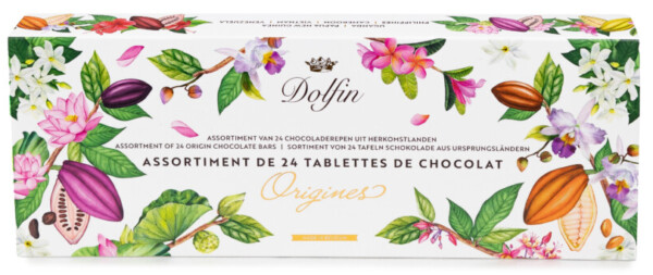 Partez aux 4 coins du monde avec le Coffret « Origines » de Dolfin, une invitation au voyage pour les palais les plus exigeants. Habillé d’un élégant marquage à chaud, cet écrin luxueux vous séduira par ses 24 mini tablettes d’une finesse exquise, chacune révélant le caractère unique de terroirs lointains. Les notes douces et envoûtantes du chocolat au lait du Venezuela et du Vietnam rencontrent l’intensité rare des chocolats noirs du Cameroun, de Papouasie Nouvelle-Guinée, des Philippines et de l’Ouganda.