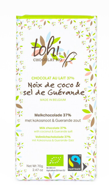 Ingrédients : Sucre de canne*, beurre de cacao*, lait entier en poudre*, noix de coco rapée* 10%, pâte de cacao*, sel de Guérande 0,2%, vanille*. Cacao : 37% minimum. Peut contenir des fruits à coque, du soja, des oeufs, du gluten et du sésame. * produits issus de l'agriculture biologique - Contrôle CERTISYS-BE-BIO-01 - www.certisys.eu. - Cacao, sucre, vanille : certifiés Fairtrade. 70% du poids total. info.fairtrade.net/sourcing.