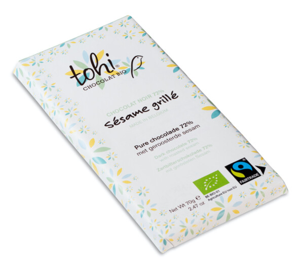 Ingrédients : Pâte de cacao*, sucre de canne*, beurre de cacao*, sésame* 6% (graine* et huile* de sésame) , vanille*. Cacao : 72% minimum. Peut contenir des fruits à coque, du lait, du gluten, du soja et des oeufs. * produits issus de l'agriculture biologique - Contrôle CERTISYS-BE-BIO-01 - www.certisys.eu. - Cacao, sucre et vanille: certifiés Fairtrade. 94% du poids total. info.fairtrade.net/sourcing.